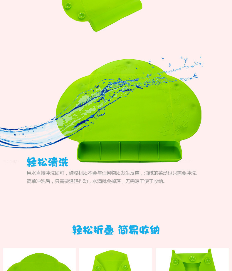 5、餐墊下面設(shè)有強(qiáng)力吸盤(pán),可以吸附在任何光滑的物品表面,不用擔(dān)心滑落,安全性高,媽媽再也不用擔(dān)心餐墊會(huì)從餐桌滑落