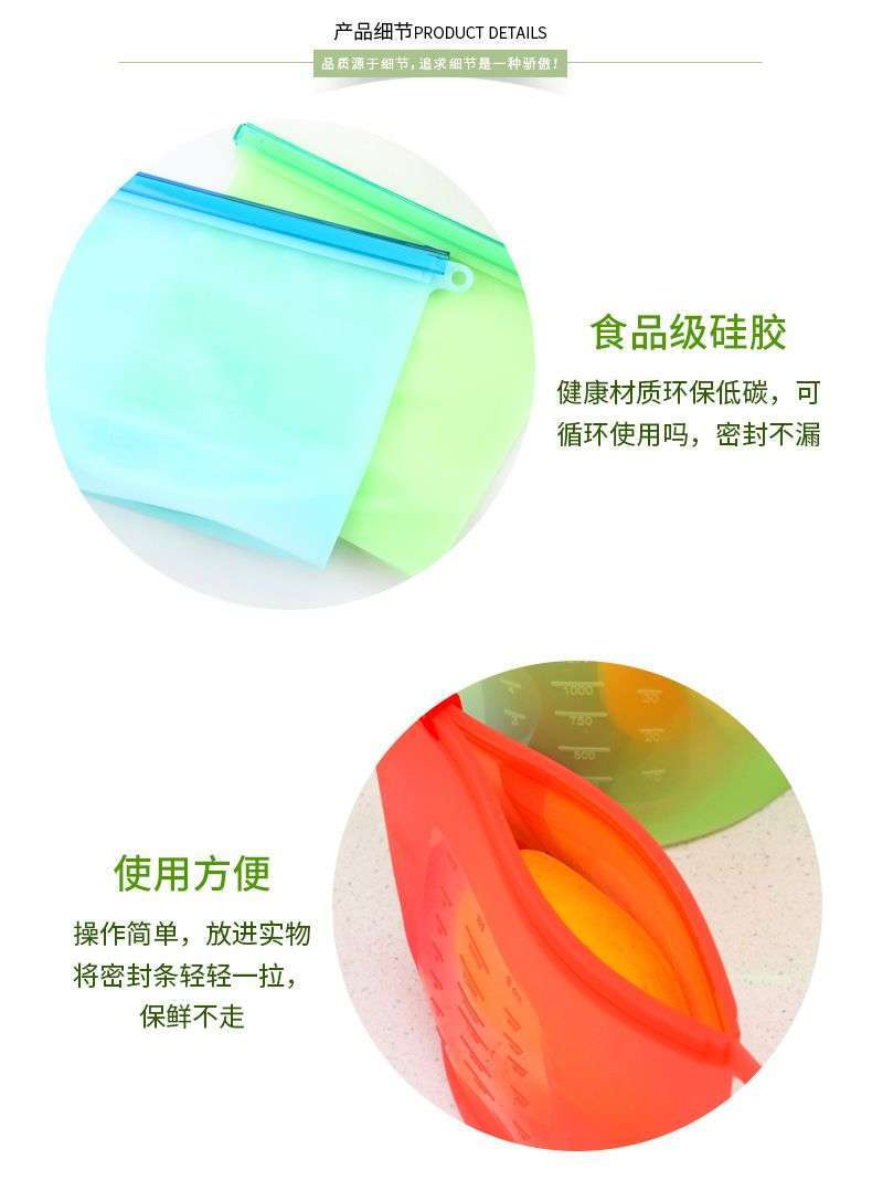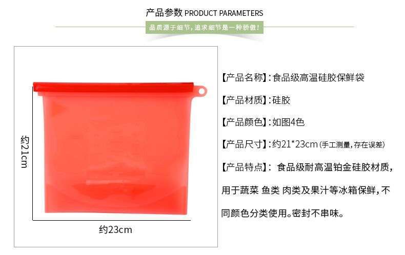 產(chǎn)品特點(diǎn):食品級(jí)硅膠材質(zhì),健康環(huán)保,拉條設(shè)計(jì),密封強(qiáng),開(kāi)取方便,蔬菜、魚(yú)類(lèi)、肉類(lèi)、和果汁都可以存放,不同顏色可以分類(lèi)使用